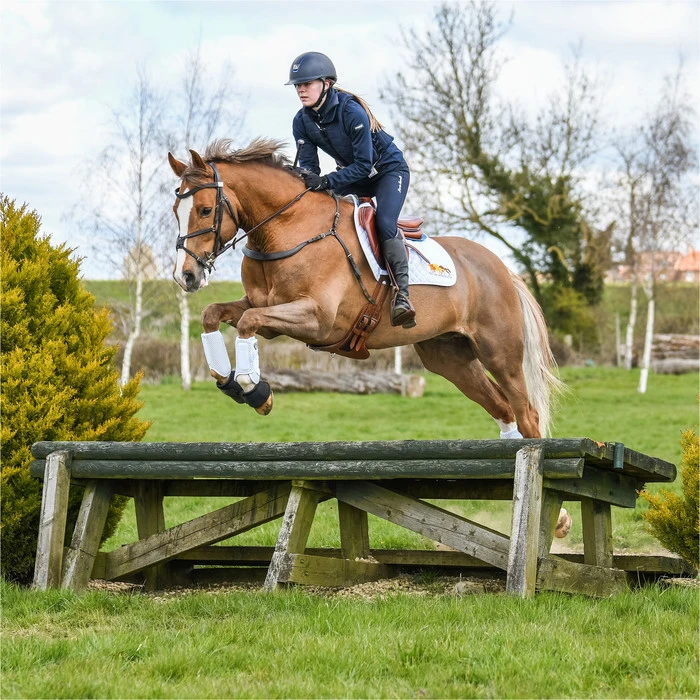- Protects from concussion and penetration injuries. Tested to protect if the horse was to hit a solid fence or strike itself.